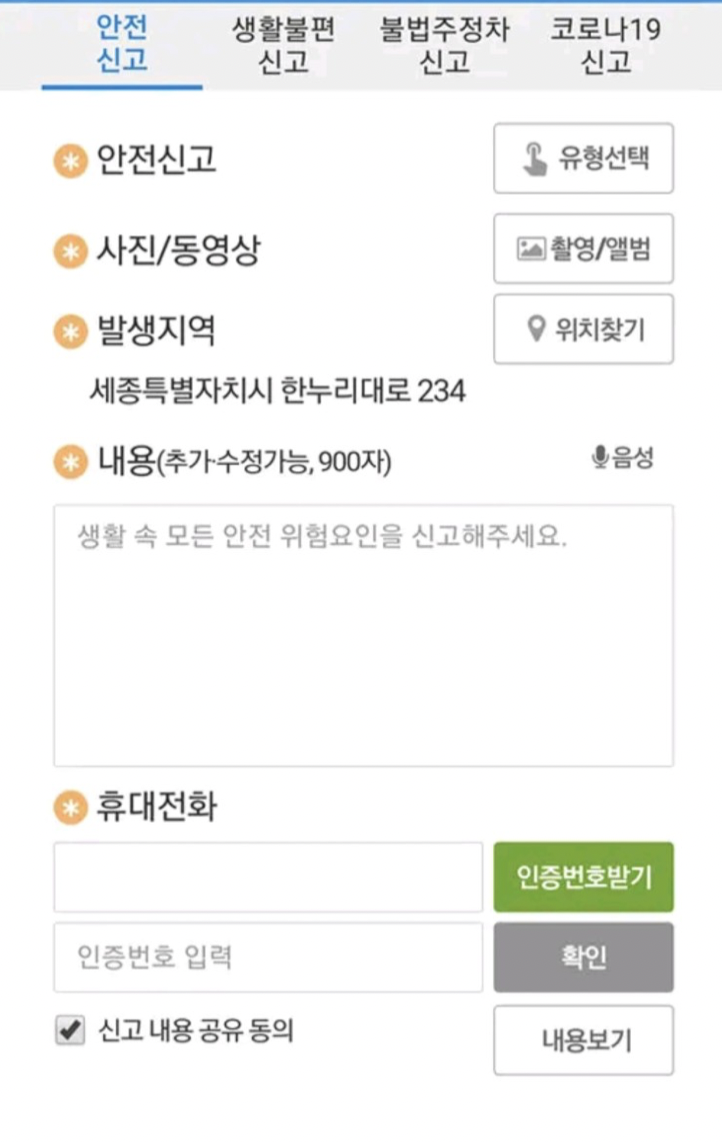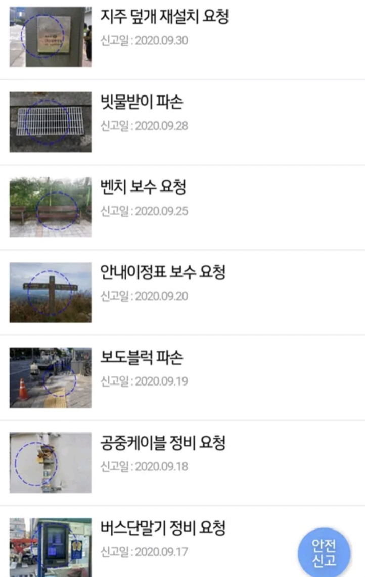 길가다 보이는 위험요소들, 그리고 학교나 교통 등 생활 전반에서 발생하는 것들을 신고할 수 있습니다. 그리고 이렇게 신고된 내용은 국민신문고와 연계되어서 처리된다고 합니다.