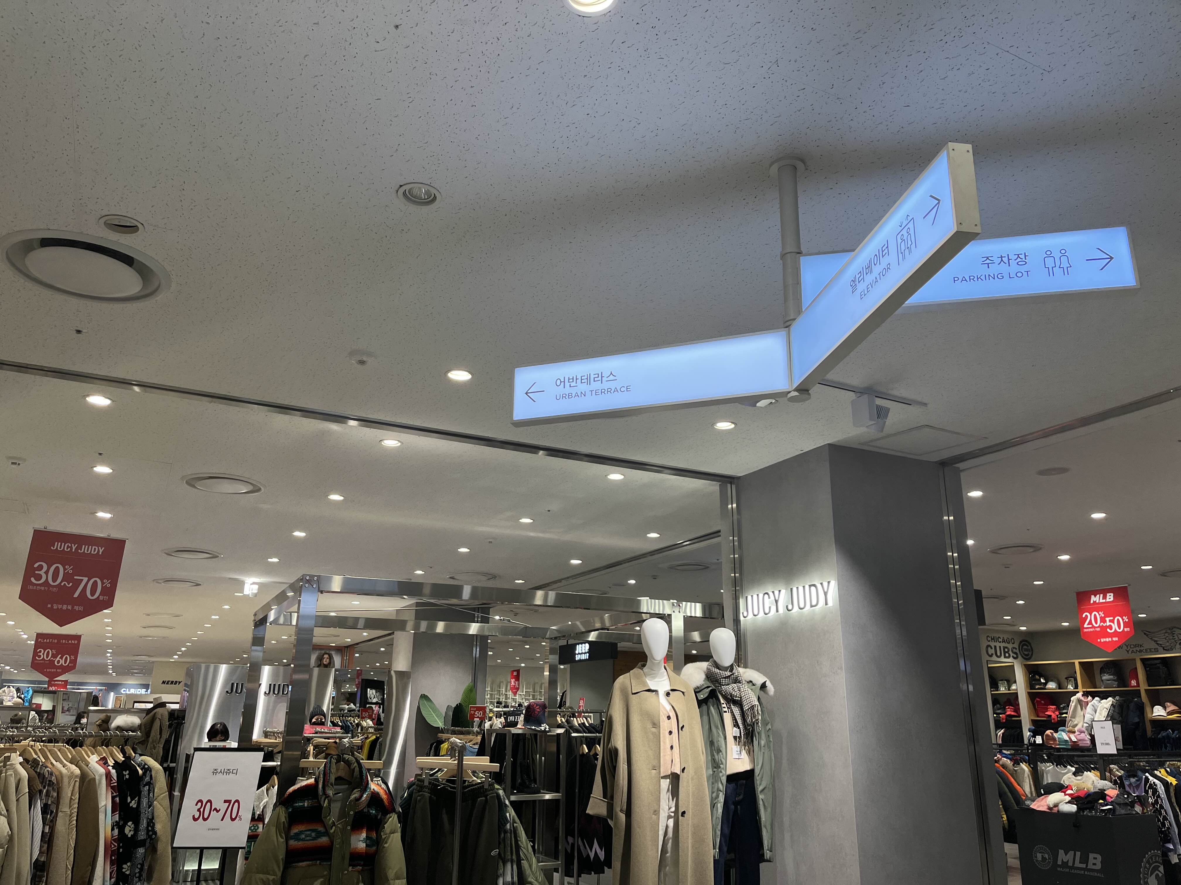 지하1층으로 에스컬레이터를 타고 내려가면 어디로 가야할지 막막한데 살짝 위를 보시면 저렇게 표지판이 되어 있습니다. 어반테라스 라고 써있는 쪽으로 쭉 들어가시면 소년피자가 나옵니다.