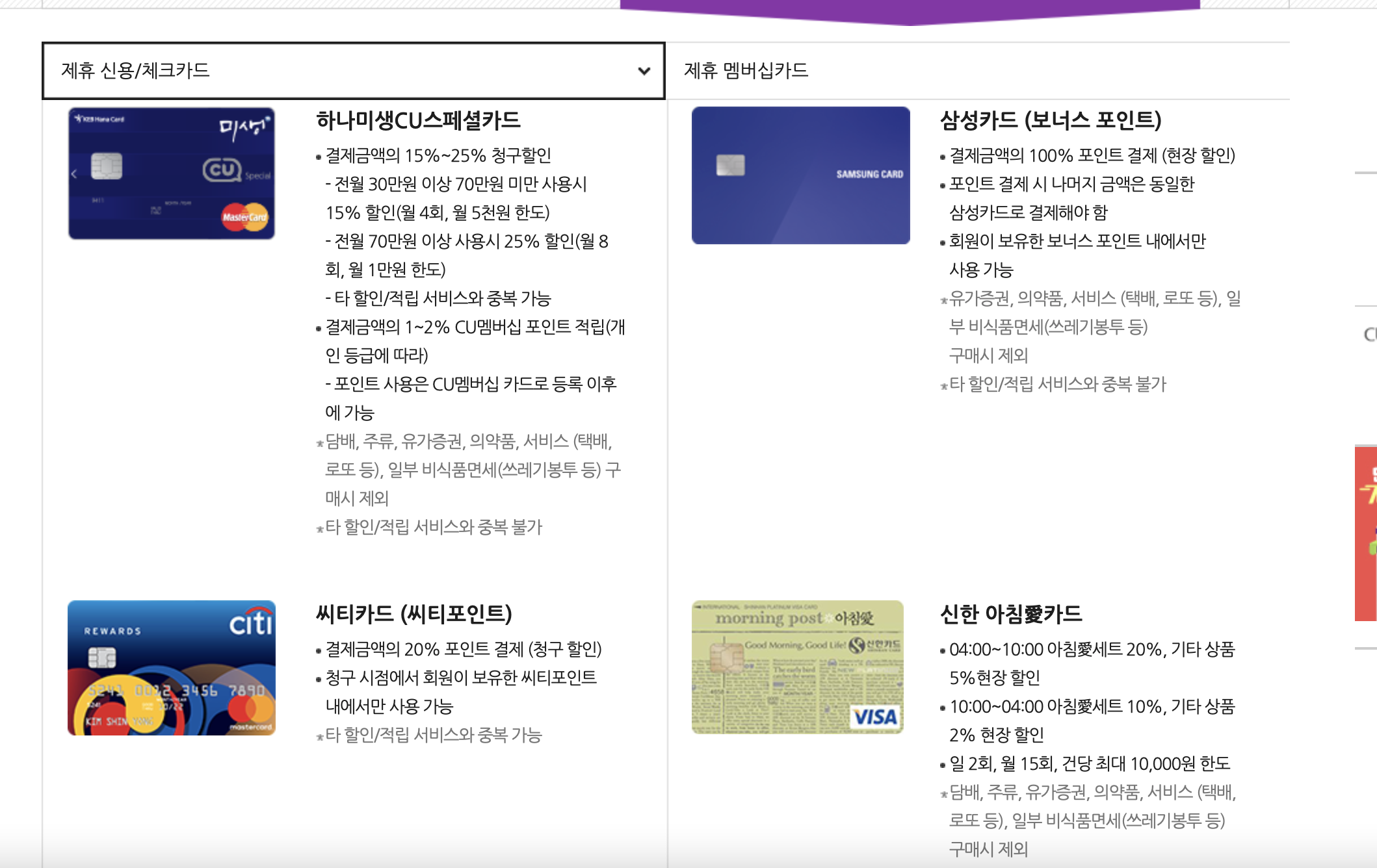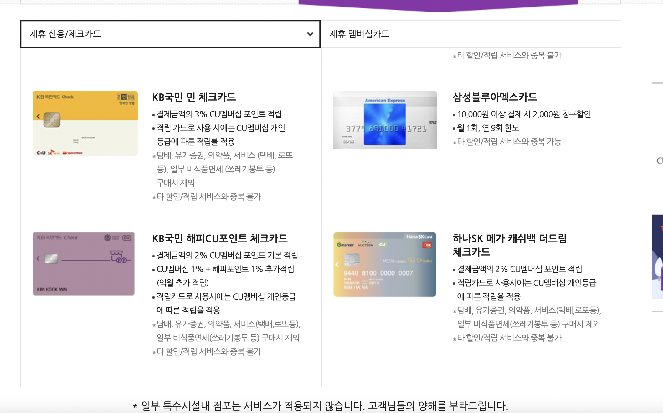 생각보다 많은 카드사에서 할인율을 보이거나 적립이 되니, 씨유 편의점을 자주 이용하시는 분들에게 꿀정보인것 같습니다. 다만 일부 특수시설내에 있는 점포에서는 서비스가 적용이 불가하니 참고하시기 바랍니다.