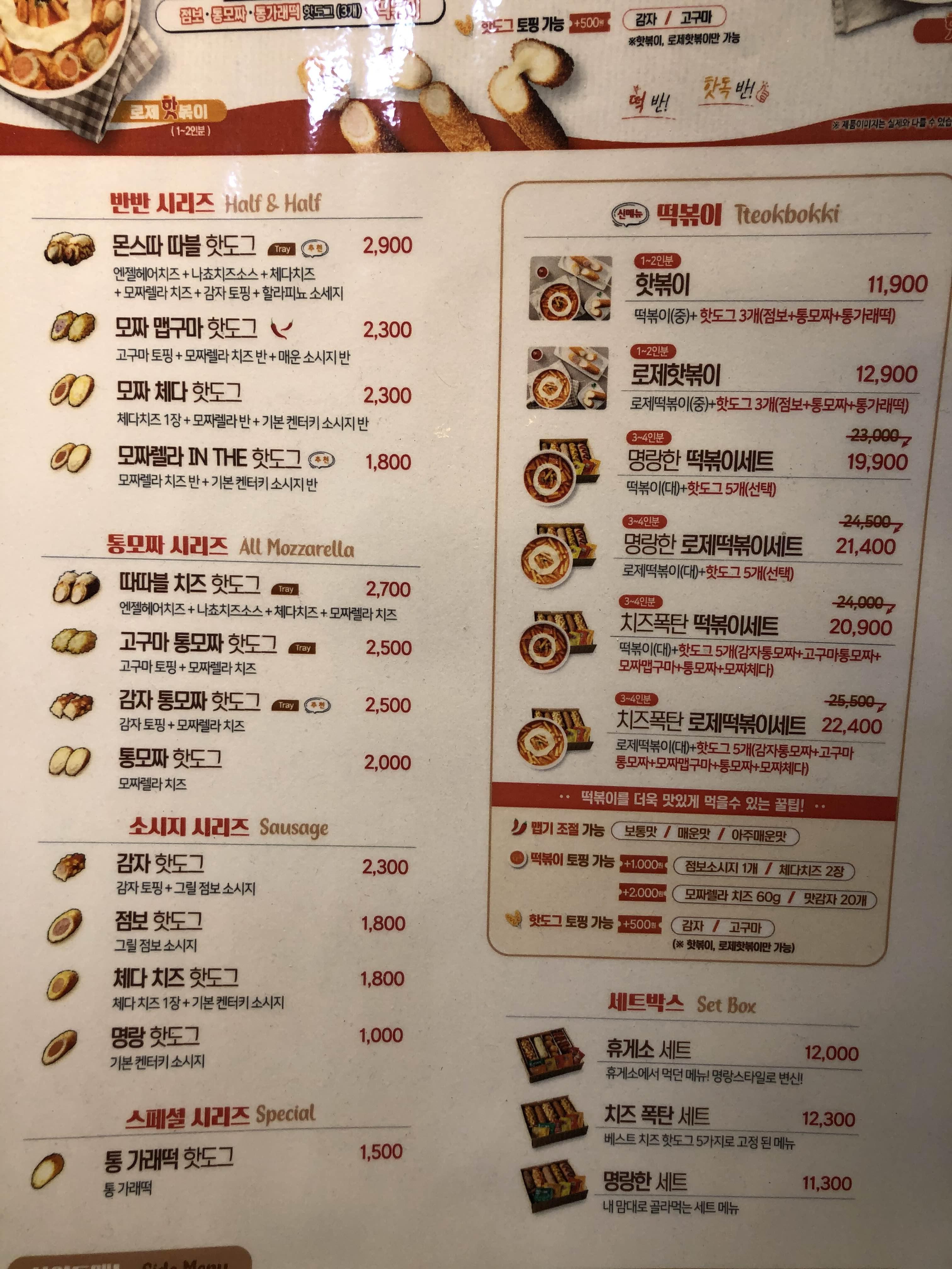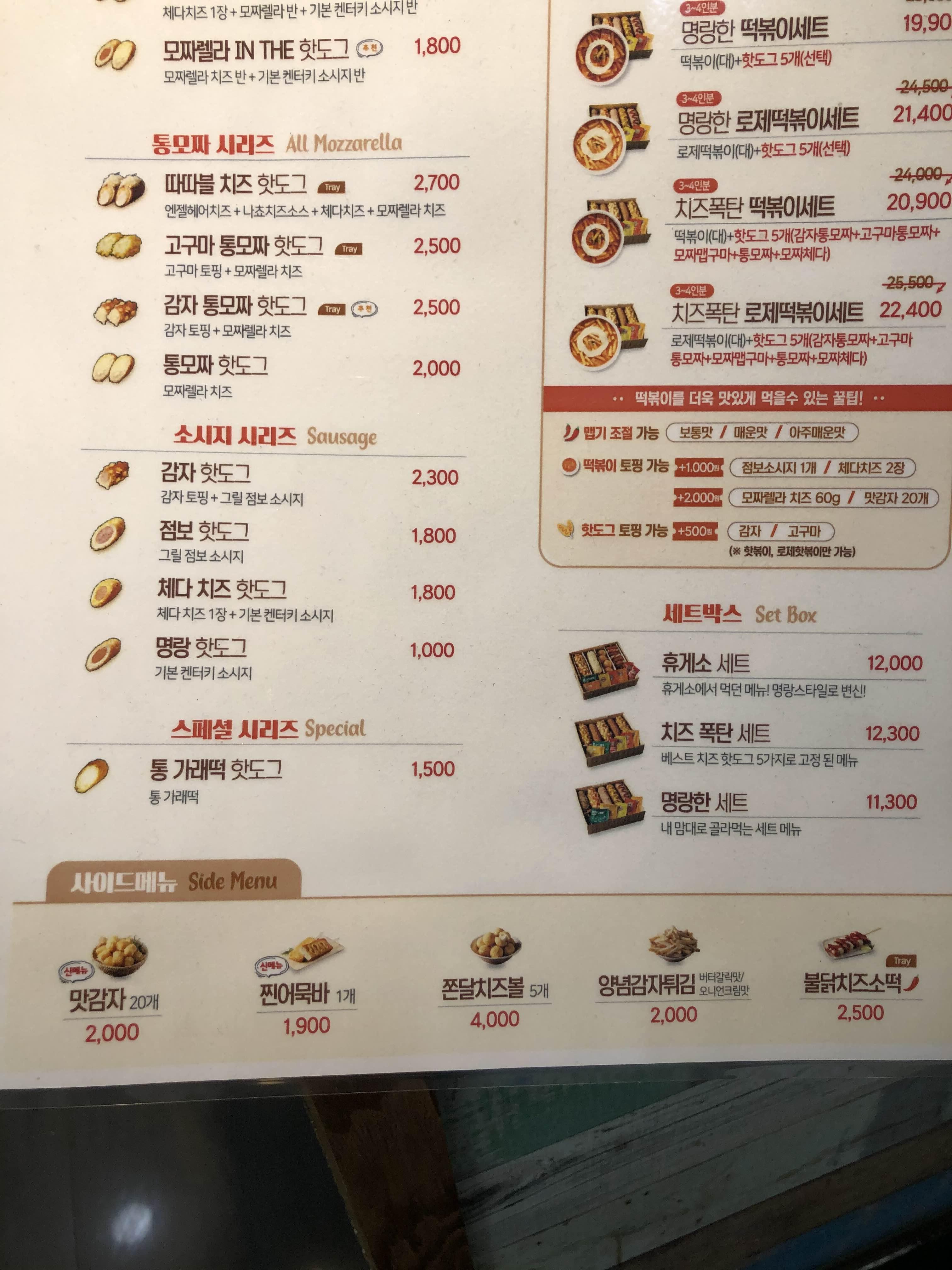 소시지 시리즈인 감자핫도그 2300원, 점보핫도그 1800원이고, 통모짜시리즈는 통모짜 2000원, 감자 통모짜 2500원, 고구마통모짜 2500원, 따따블 치즈 2700원입니다.