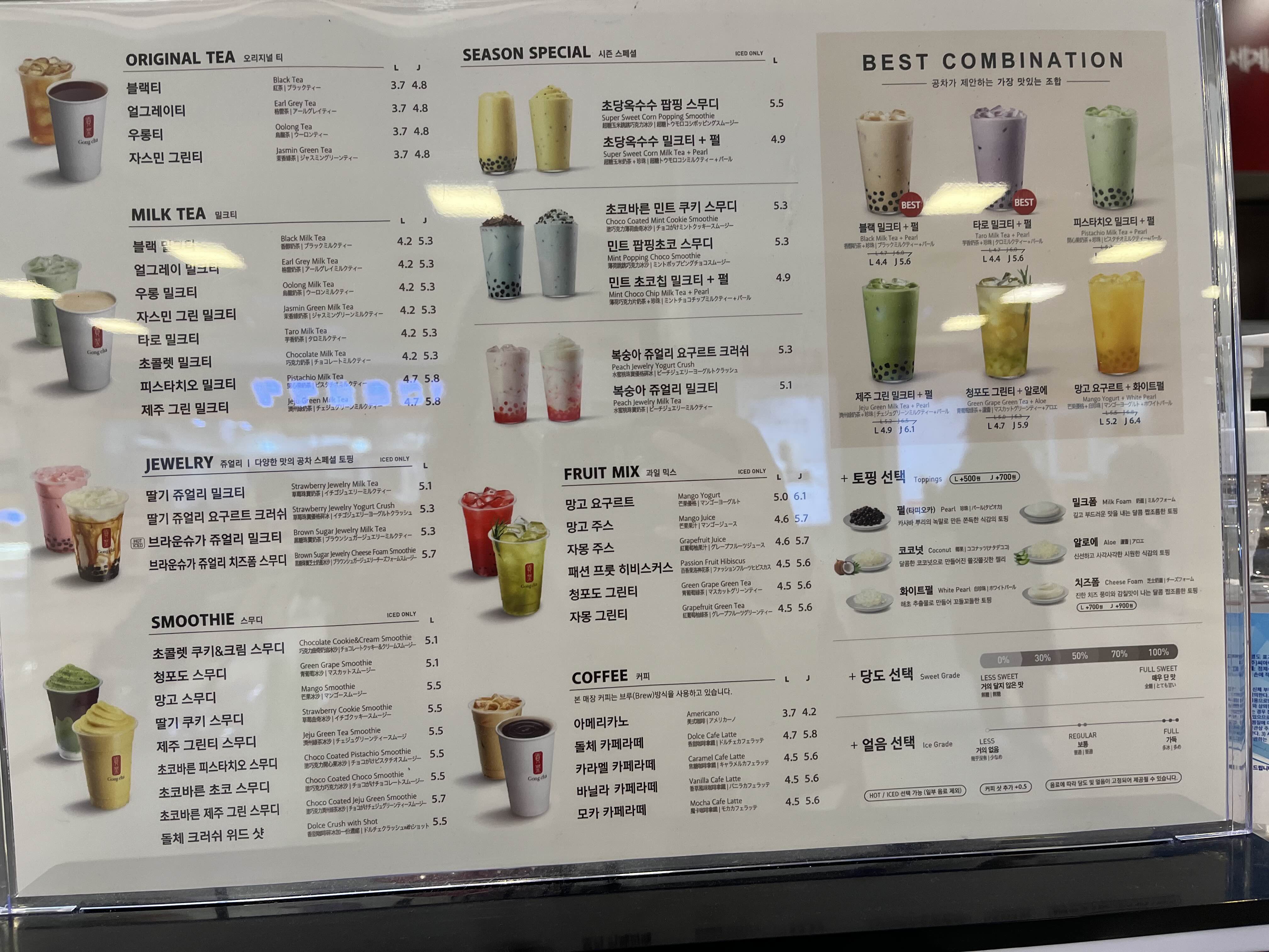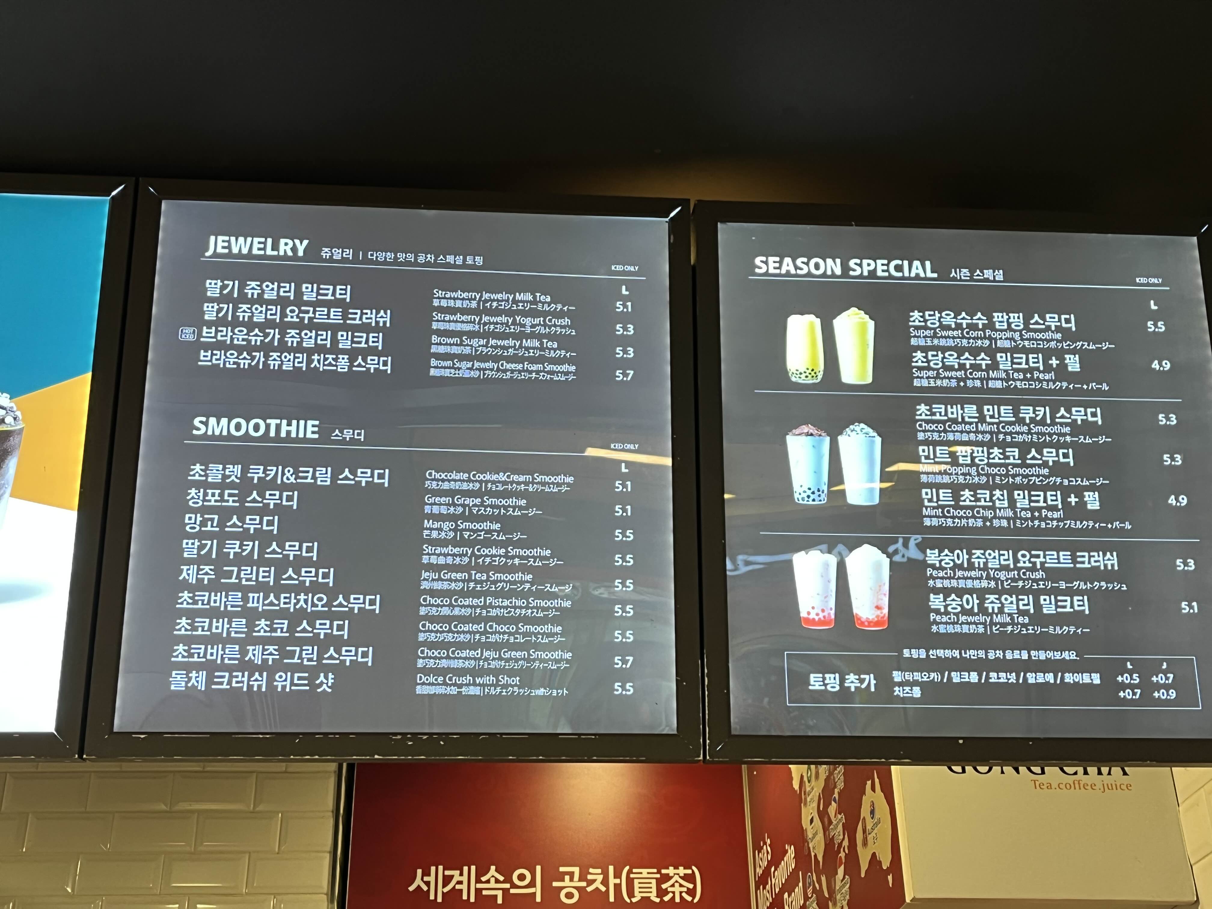 가장 기본인 오리지날 밀크티부터 밀크티, 스무디 커피 등 선택의 폭이 상당히 다양한데요, 블랙밀크티, 얼그레이 밀크티 등 가격은 4200원부터 형성되어 있습니다. 그리고 공차 스페셜 토핑이 들어간 쥬얼리밀크티는 5100원부터 되어있습니다.
