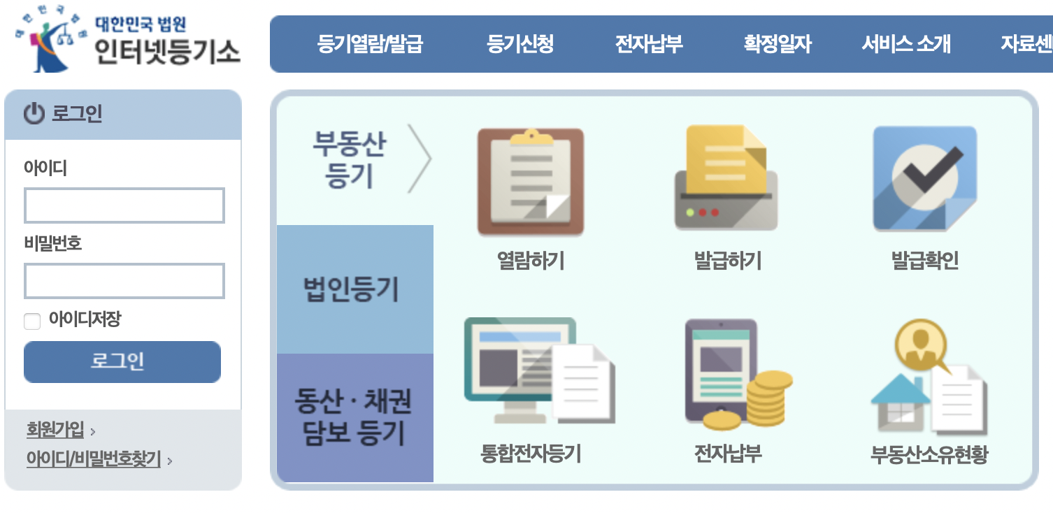먼저 포털사이트에서 인터넷 등기소를 검색하시면 아래와 같은 홈페이지 화면이 나옵니다.