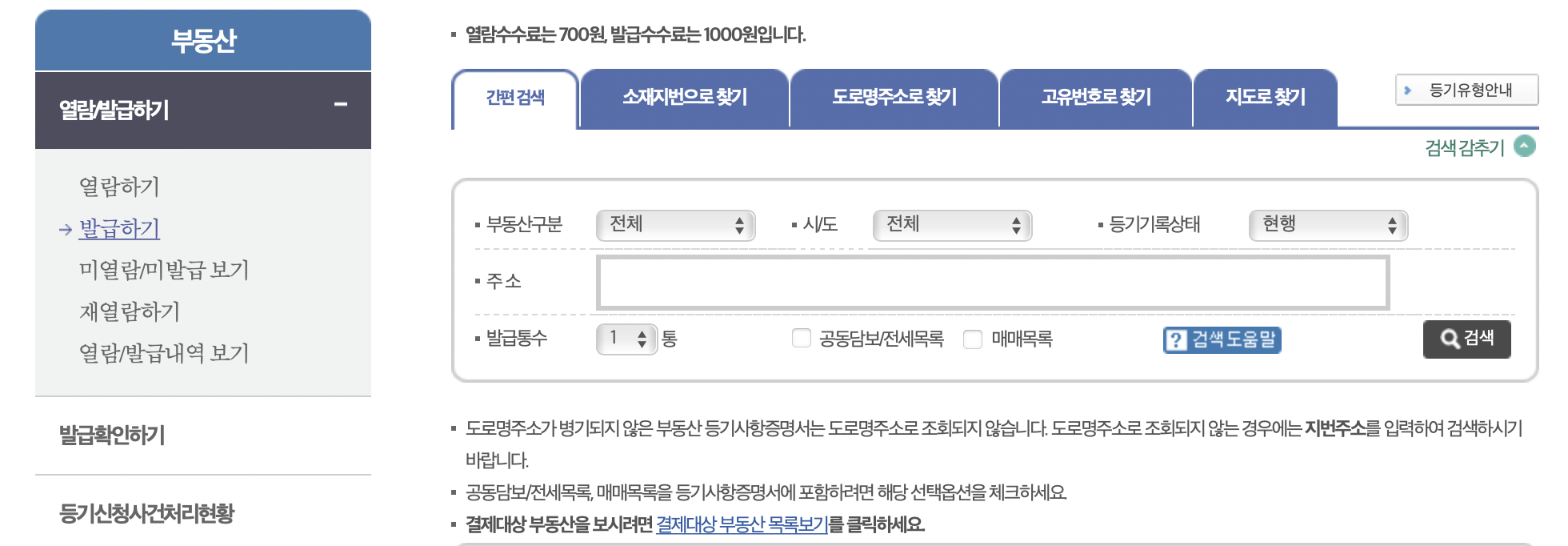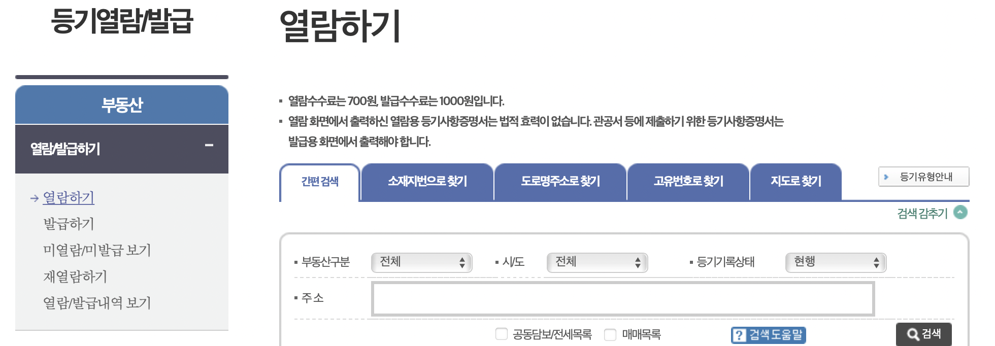 주소도 소재지번으로 혹은 도로명주소, 고유번호, 지도 등 다양한 방법으로 조회가 가능합니다. 간단하게 등기부등본을 열람 혹은 발급하실수 있겠습니다.