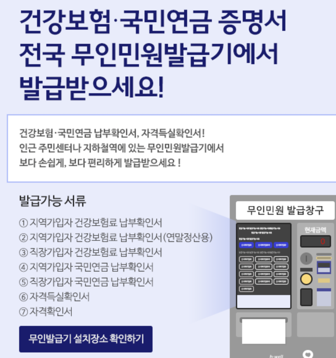 그리고 무인발급기를 통해서 건강보험이나 국민연금 증명서 납부확인서 모두 발급이 가능하니, 인터넷이 어려우신분들은 이렇게 오프라인으로 쉽게 확인서를 발급받으실 수 있습니다.