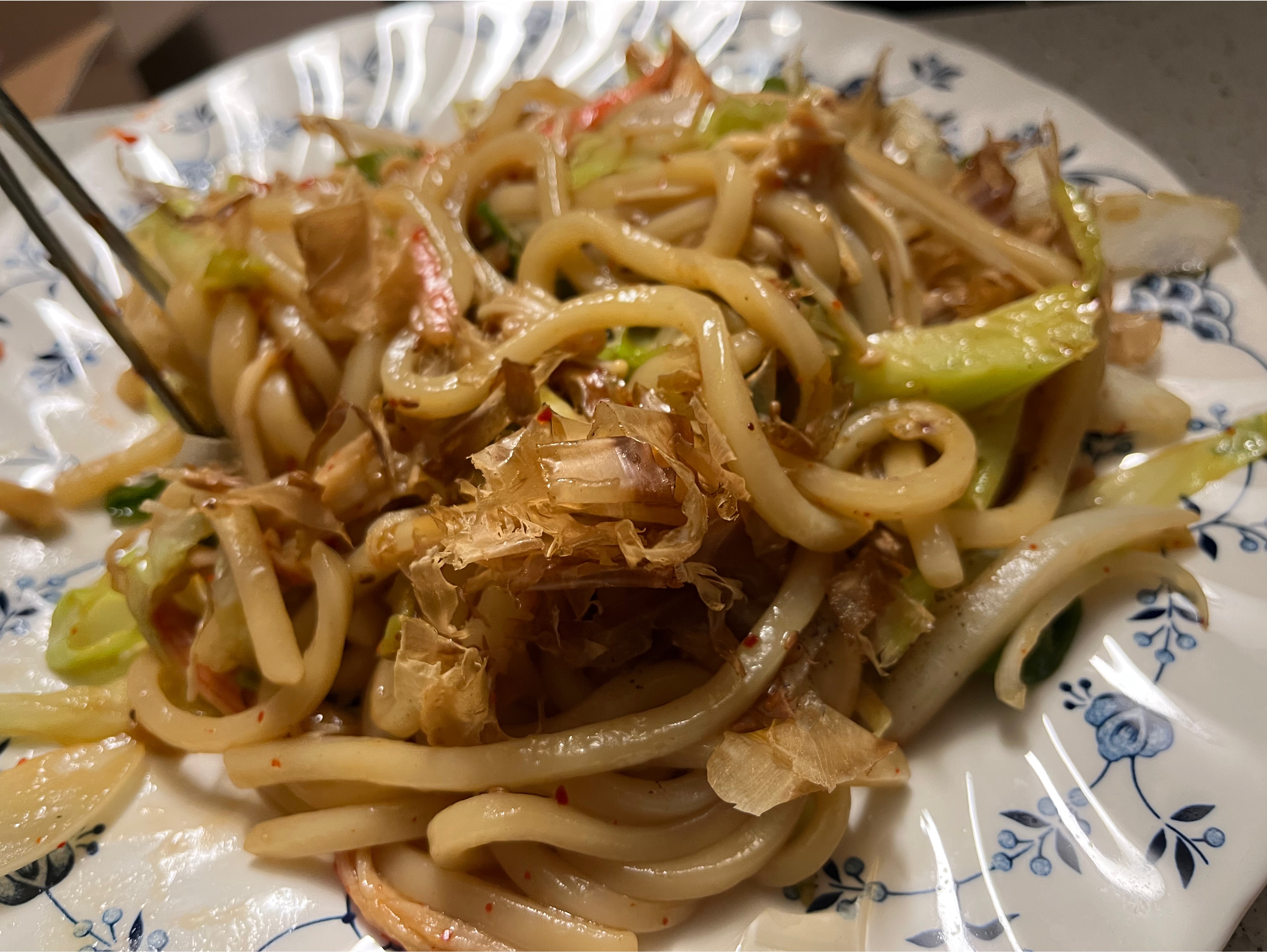 그리고 삶아진 우동면을 투하! 마지막에 가스오부시로 마무리해주면 끝! 정말 간단하죠?