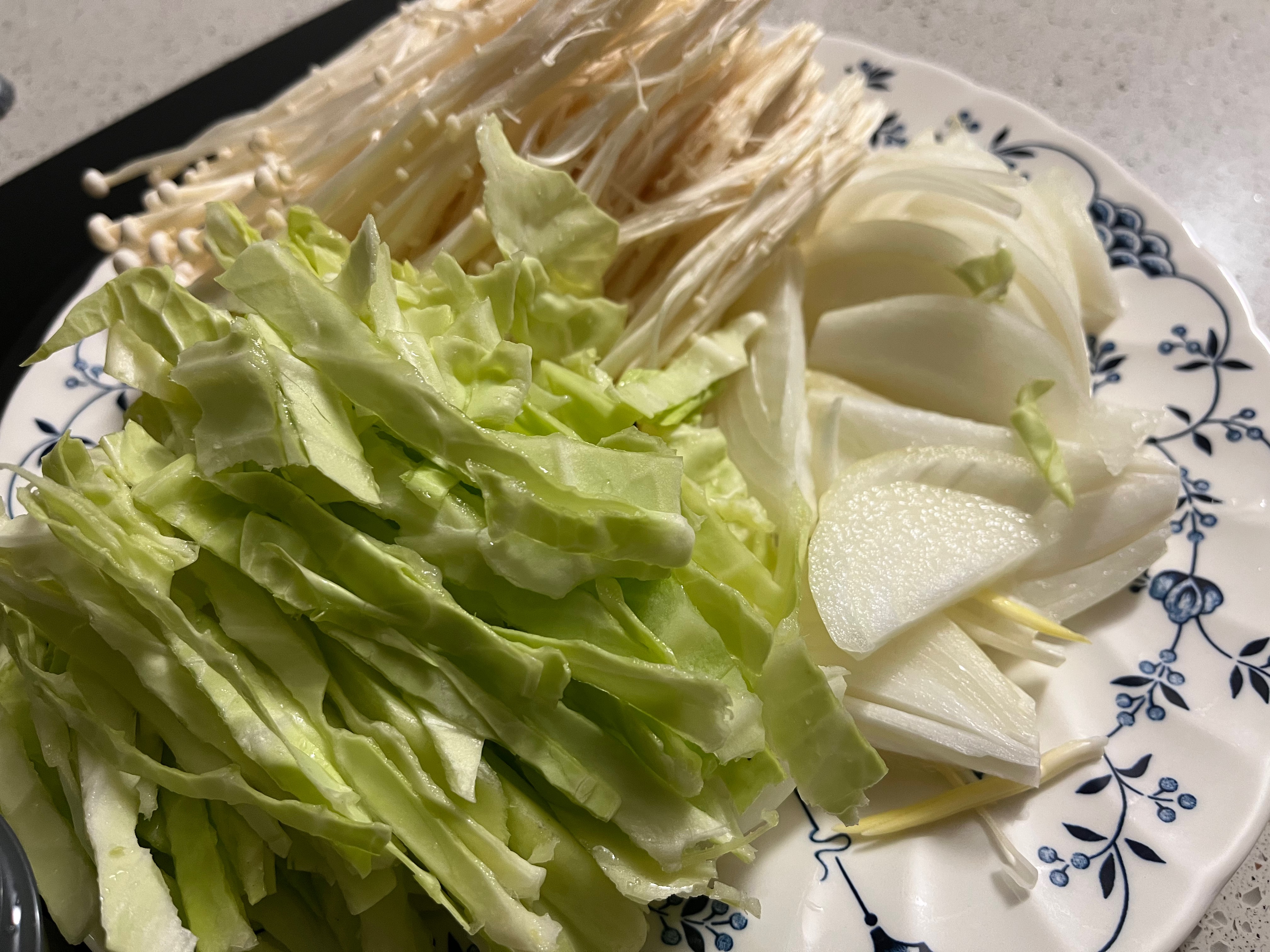 먼저 냉장고 야채를 준비해주세요. 제가 준비한건 양배추, 양파, 팽이버섯이고 맛살도 넣어주었습니다. 어묵도 있으시면 같이 넣어주세요.