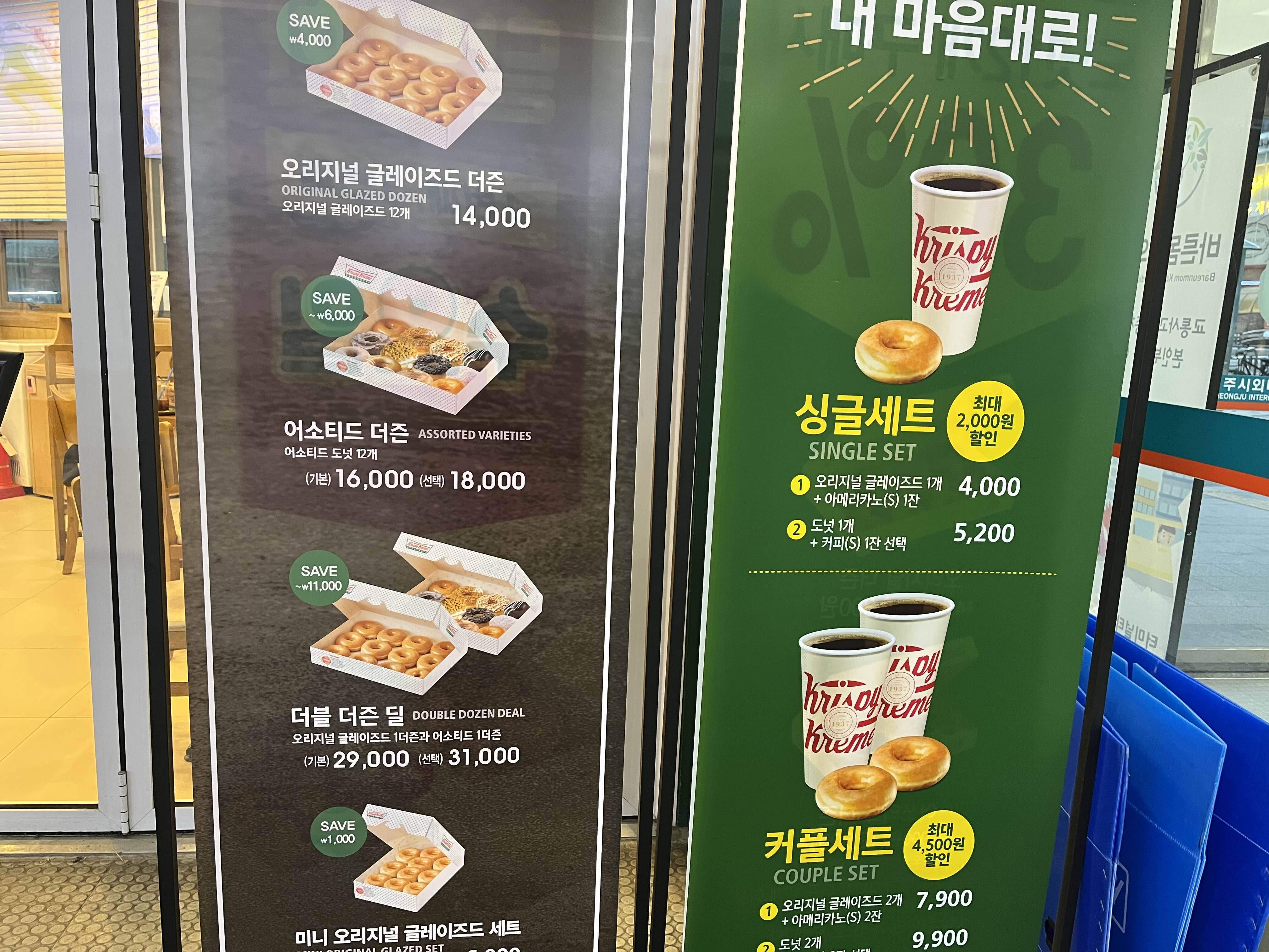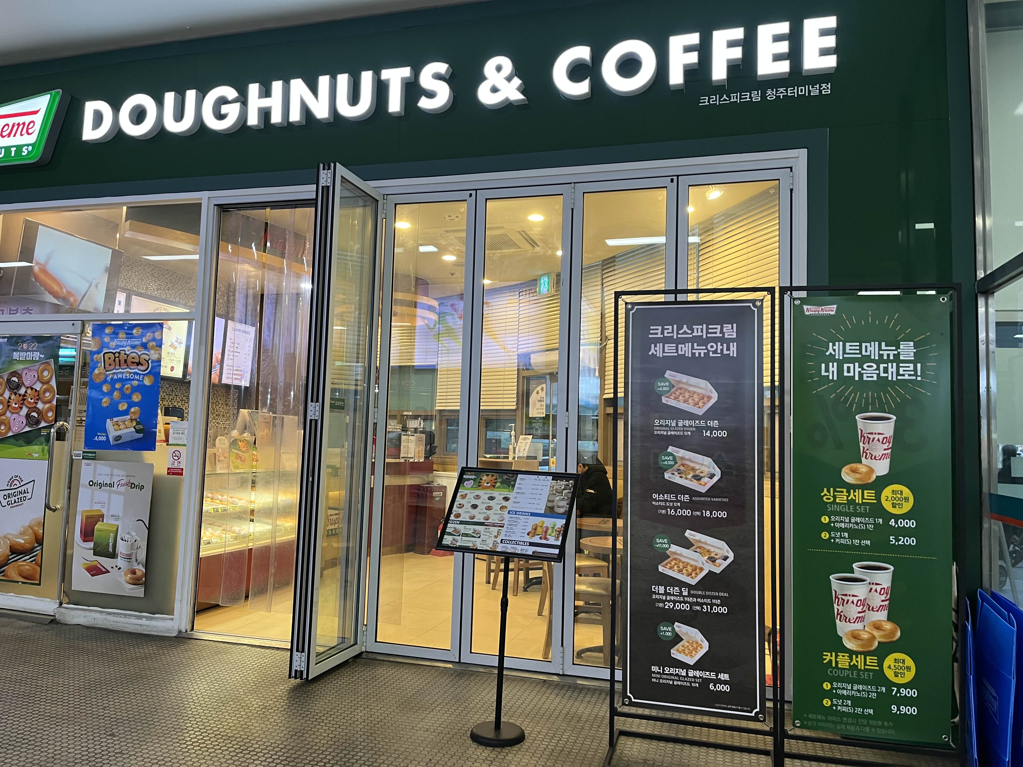 여긴 청주 터미널점의 크리스피크림 도넛인데 개인적으로 버스기다리면서 저렴하게 먹을 수 있는 싱글셋트가 좋아보입니다. 버스시간이 조금 많이 남았다면 여기서 커피한잔 도넛 맛있게 먹으며 여유있게 기다리는것도 좋은 선택인것 같습니다.