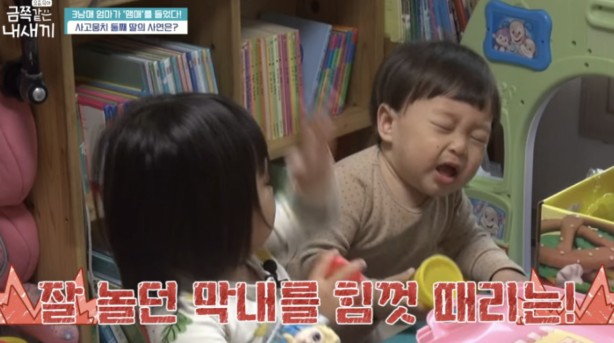 그리고 아이들끼리 노는 장면에서도 막내를 툭툭 쳐서 울리게 만들고, 매트에서 놀다가 동생다리가 매트에 끼자 누르면서 좋아하는 모습을 보입니다. 그리고 떡볶이 먹는데도 혼자 돌아다니고 먹지말라고 하는 아이.