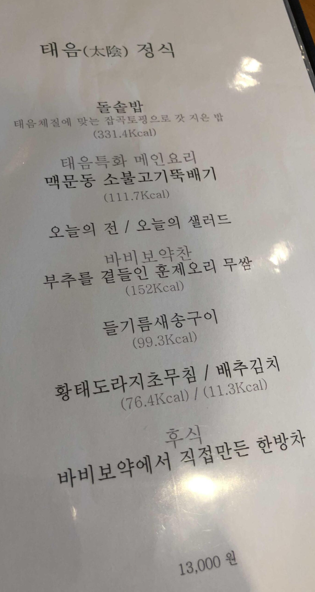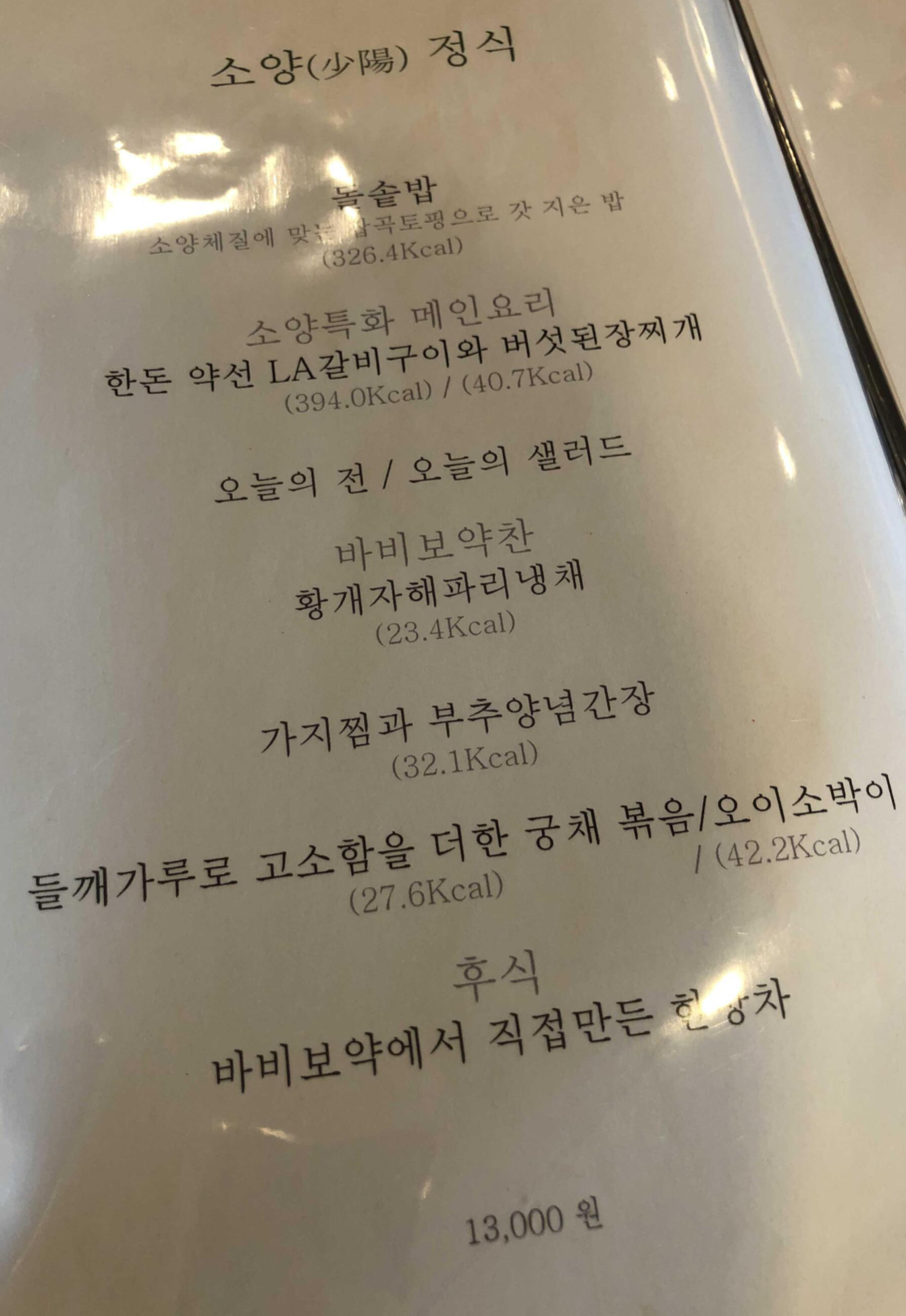 정식은 균일한 가격 13,000원이고 한눈에 어떤 메뉴가 주메뉴인지, 반찬은 뭐가나오는지 보여서 좋았어요.