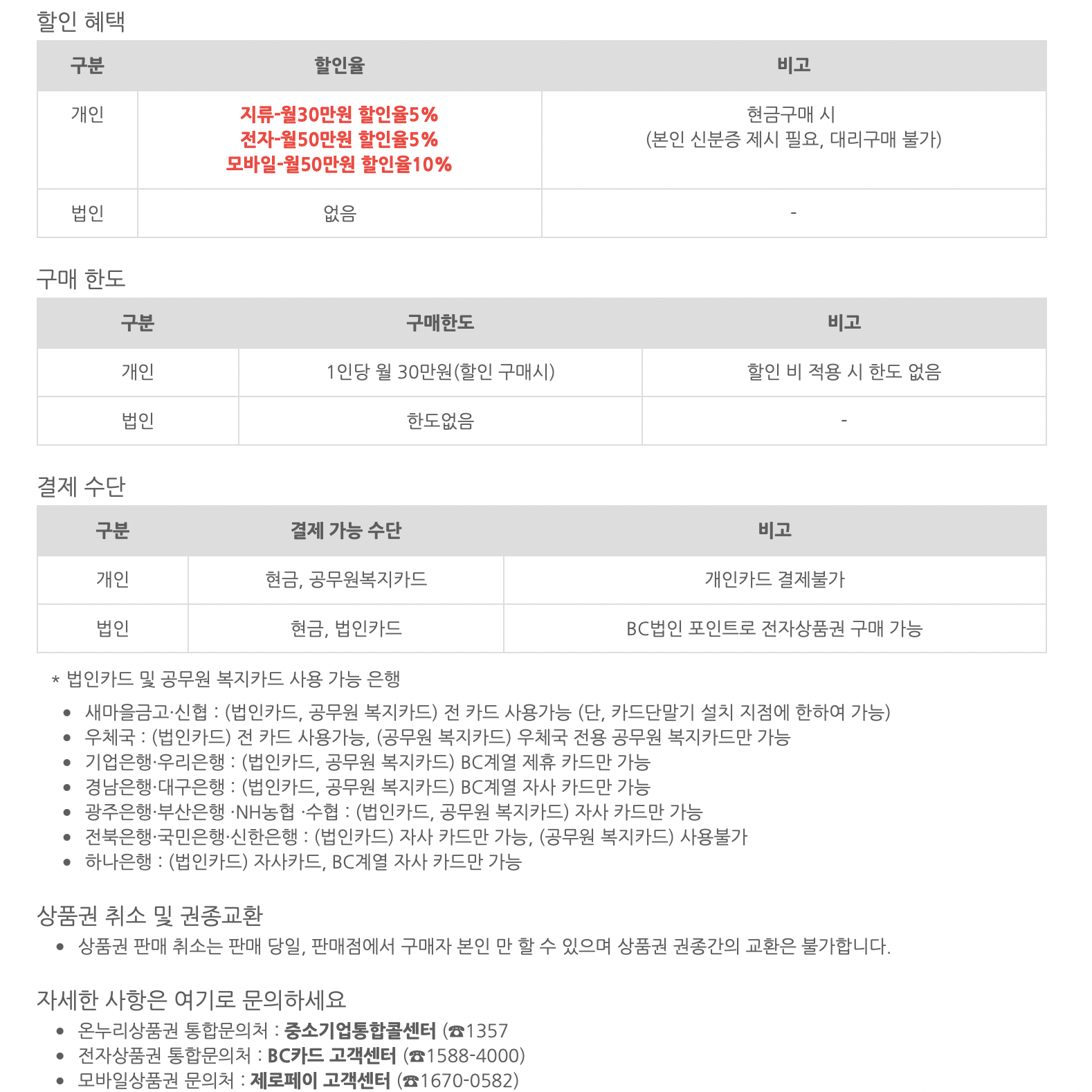 이렇게 지류와 모바일 할인폭이 다른데요, 지류는 월 30만원 5%까지 할인이 가능하고, 전자는 50만원 5%할인 그리고 모바일은 50만원 10%할인이 가능합니다. 이왕 이용할거면 모바일로 하는게 훨씬 할인혜택이 크네요. 그리고 현금이나 법인카드로도 구매가 가능하니 확인하시기 바랍니다.