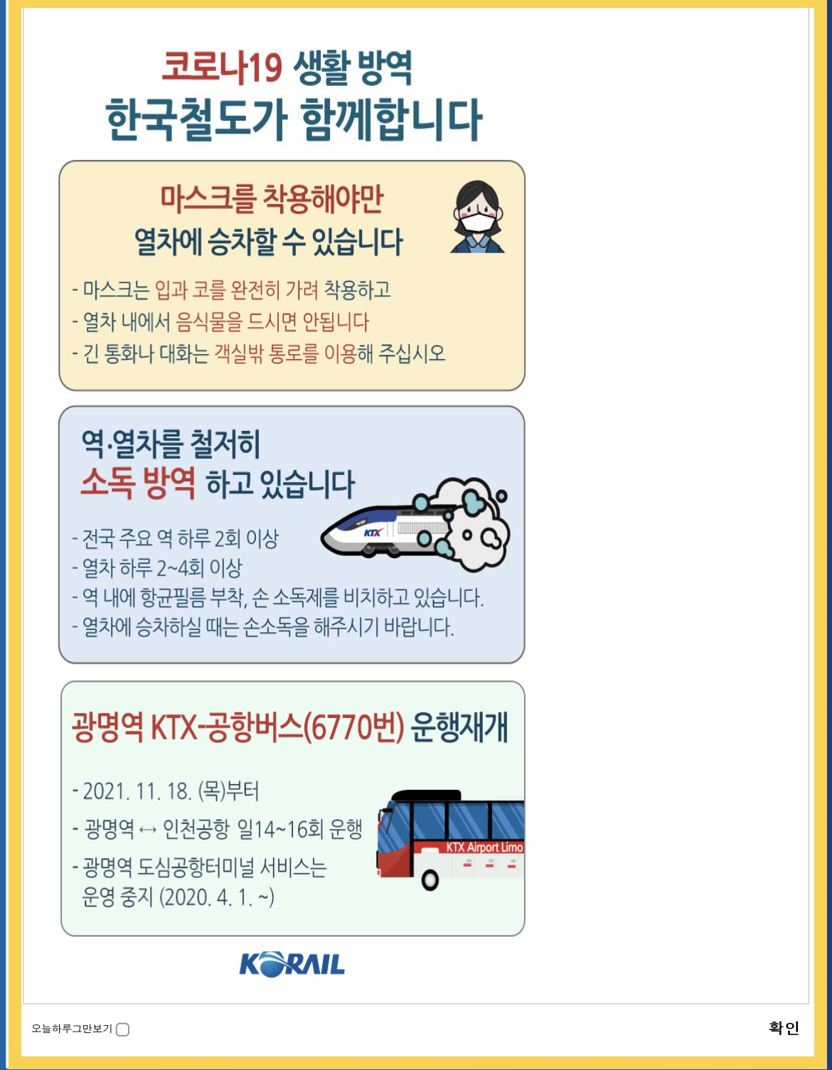 코로나로 대중교통 이용에도 영향이 있지만 코레일에서 소독을 정기적으로 하고 있고 관리를 철저하게 하고있다니 안심하고 이용할 수 있겠습니다. 그대신 마스크 사용은 필수이니 탑승전에 꼭 챙겨서 가시길 바래요!