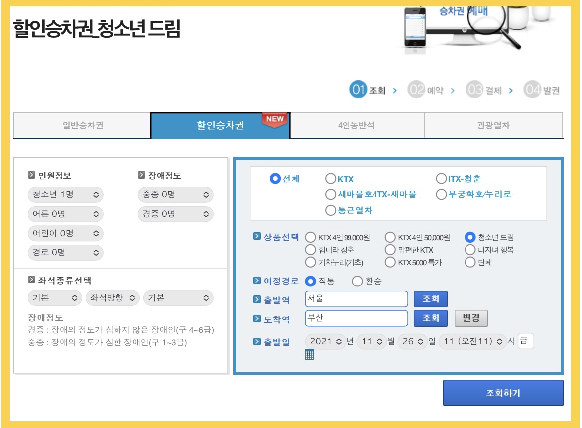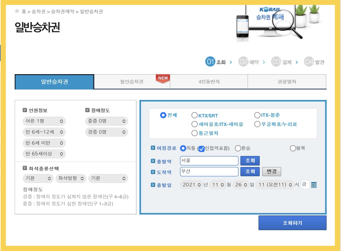 그리고 KTX 경로우대 할인도 있는데요, 만 65세 이상이면 거기에 인원수를 체크하고, 혹시 장애인이시라면 장애정도로 명수에 체크하면 할인된 요금이 적용됩니다.