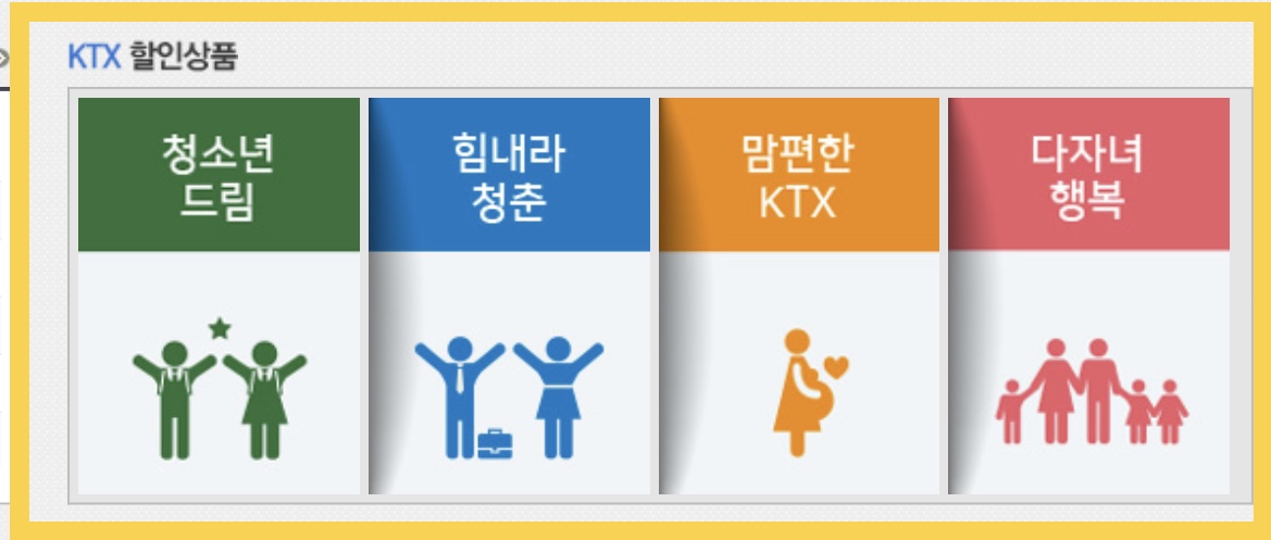 KTX 는 할인상품이 있는데요, 청소년드림,힘내라청춘, 예비맘들을 위한 맘편한KTX, 그리고 다자녀가정을 위한 다가정행복 할인상품이 있습니다.