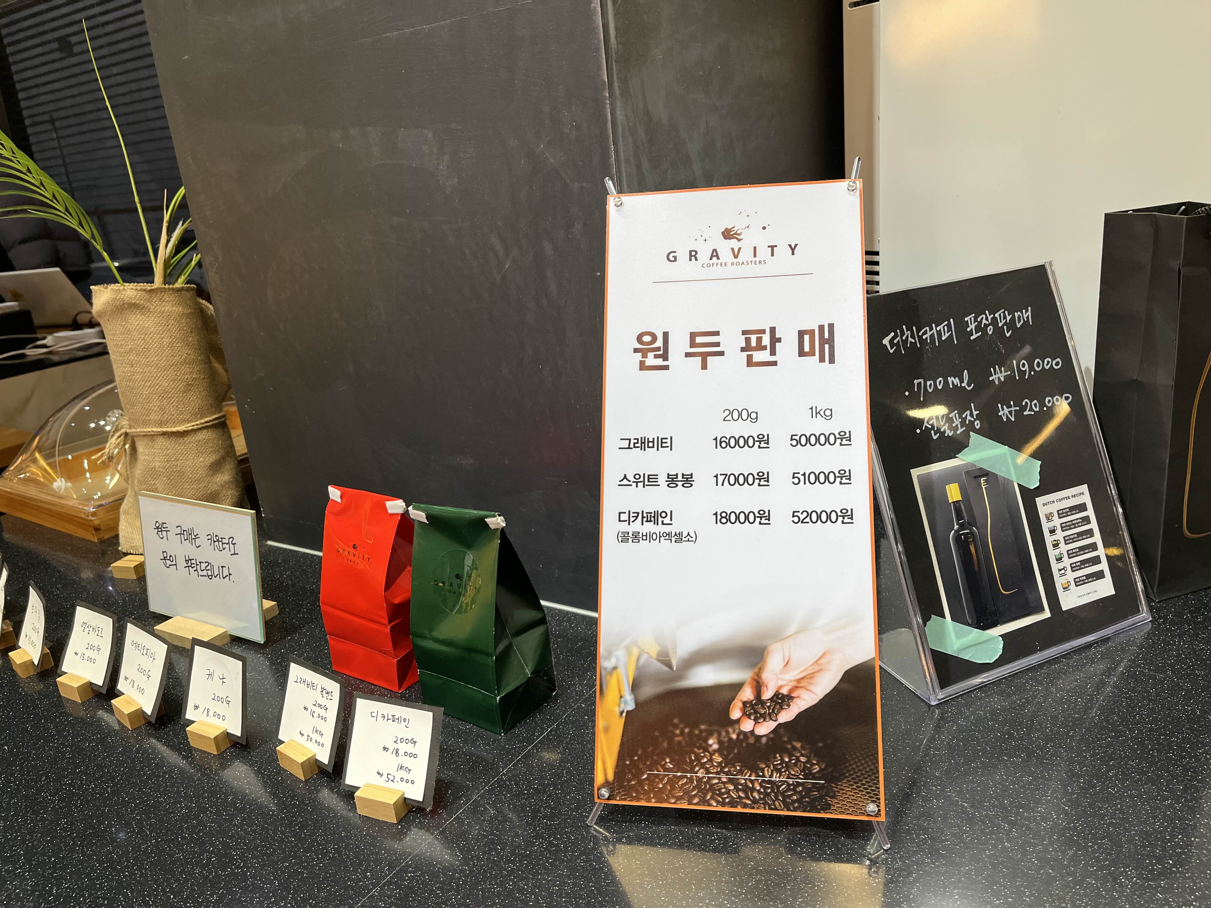 천안 신불당카페 추천 그래비티에서는 원두도 판매하고 있어요. 가격이 만만하지는 않지만 커피 드셔보시고 맘에드시면 원두구입도 좋을 것 같네요.
