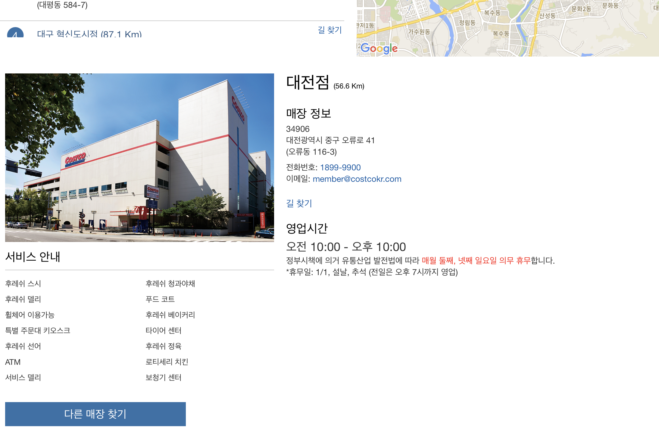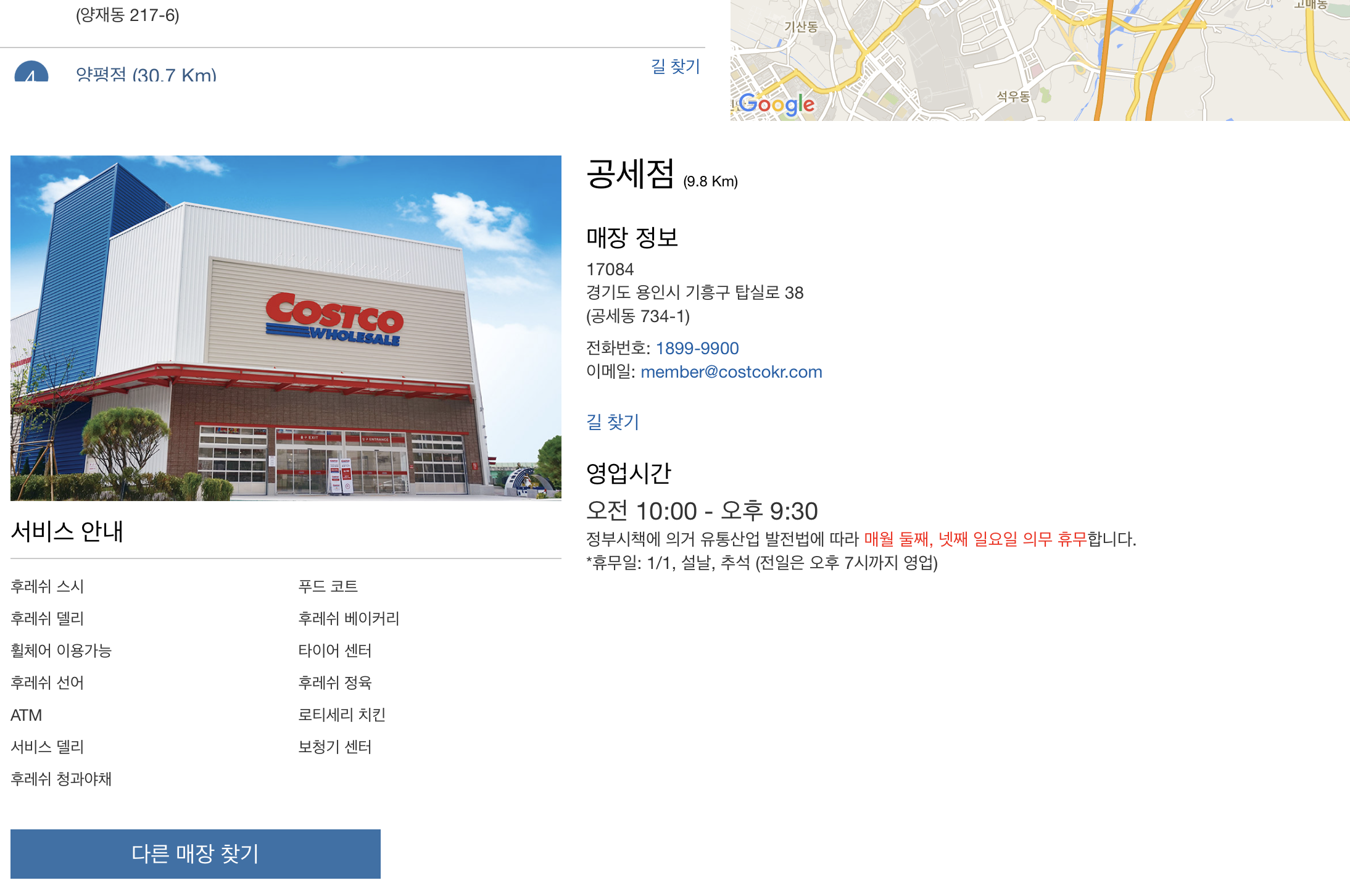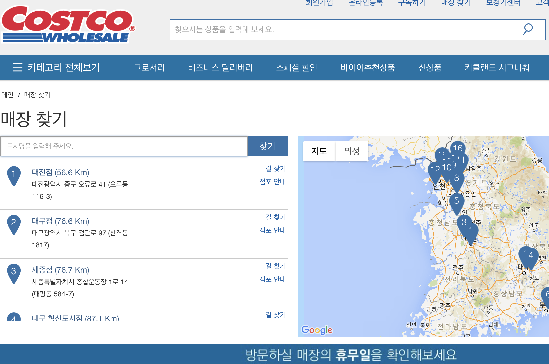 코스트코 홈페이지를 열어보시면 바로 매장찾기 먼저 나옵니다. 아마 이걸로 검색하는 분들이 많아 코스트코에서도 이렇게 첫페이지에 띄워주는 것 같네요.