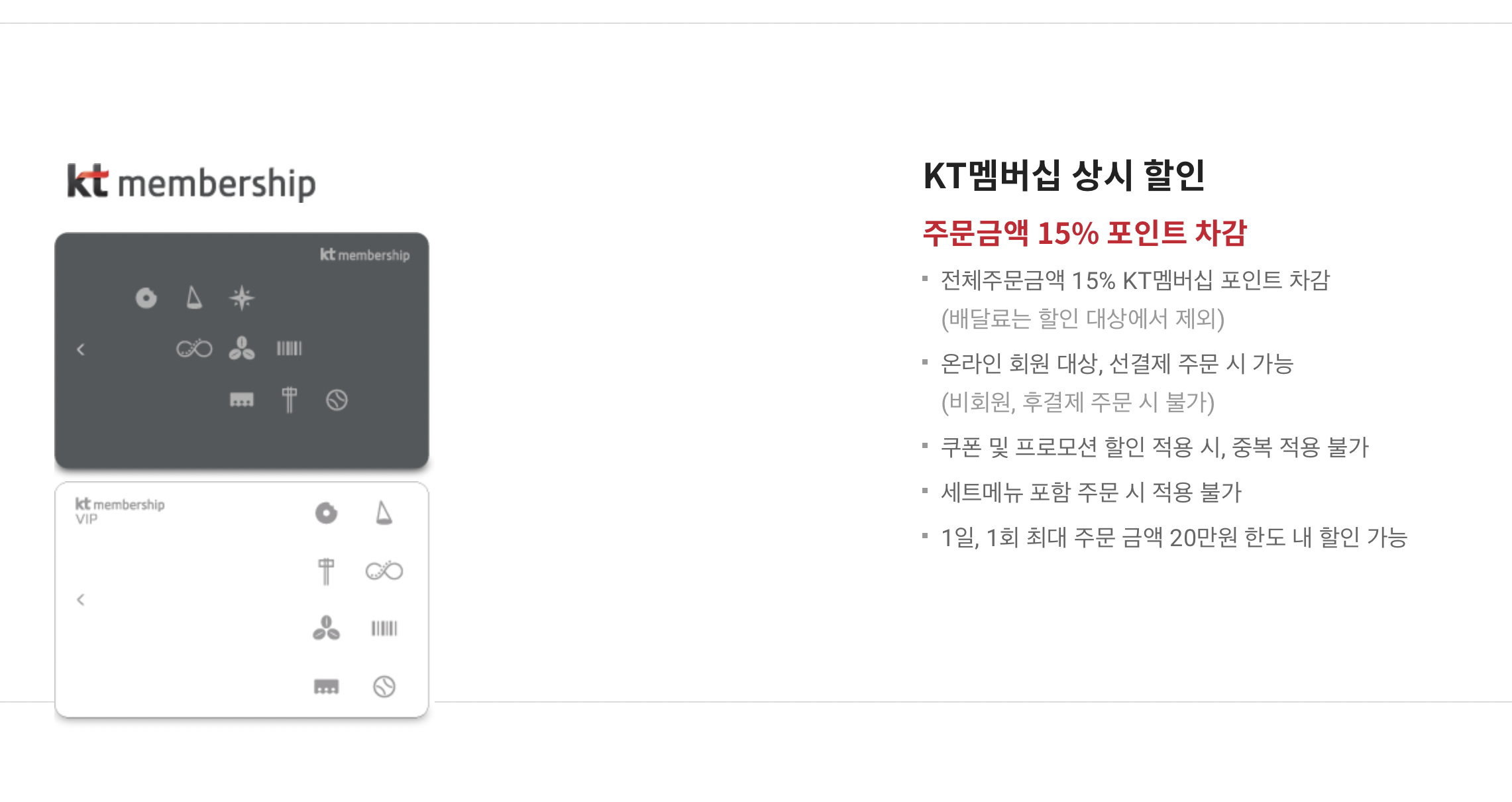 지금 케이티멤버십으로 15프로 할인 혜택을 받을 수 있습니다. 이건 온라인 회원을 대상으로 한 혜택이라 후결제주문시는 할인을 받아볼 수없고 셋트메뉴 포함주문시에도 적용이 안됩니다.