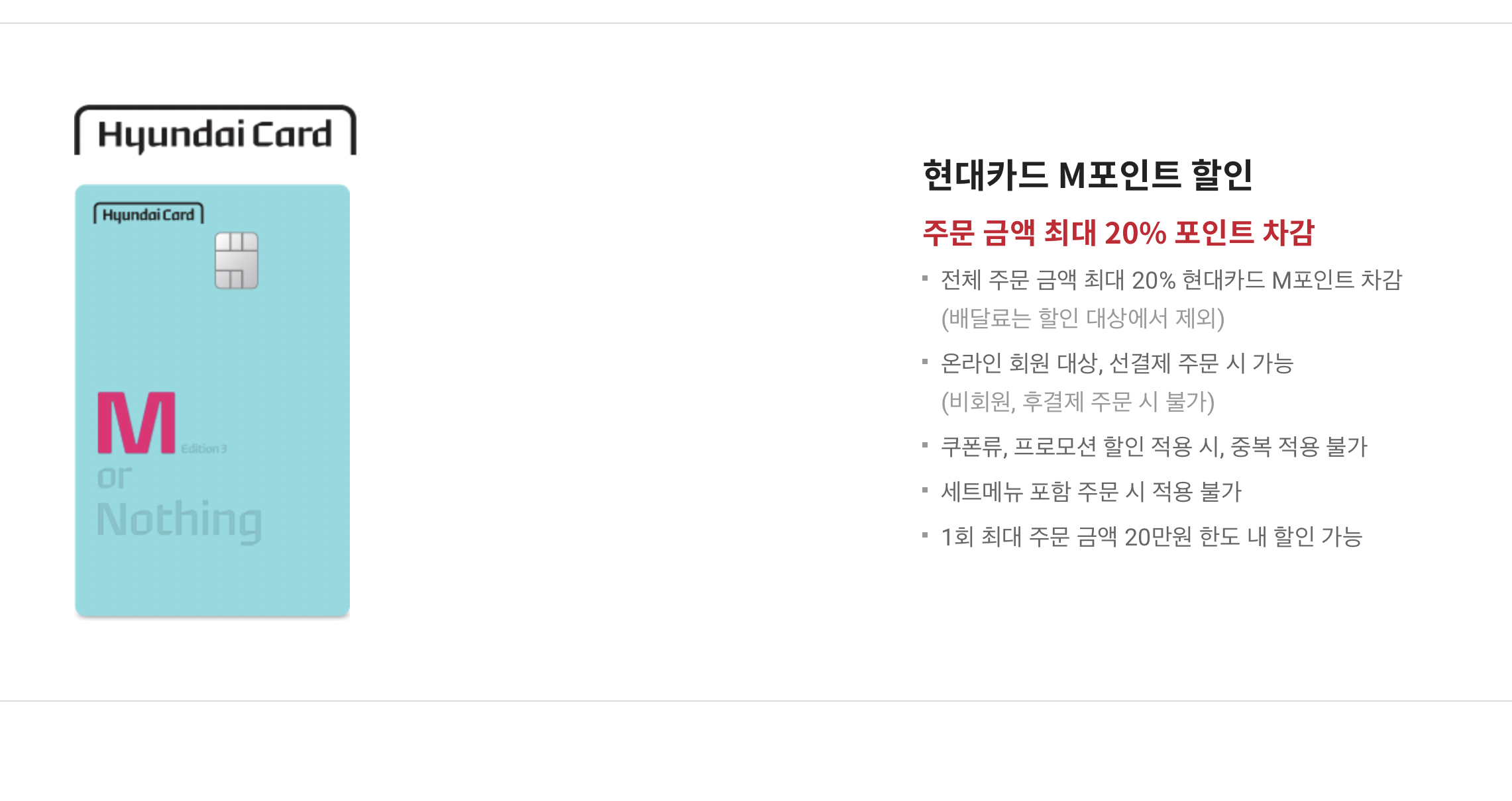 그리고 현대카드 엠포인트도 할인이 가능한데요 주문금액 최대 20프로까지 할인이 가능합니다.