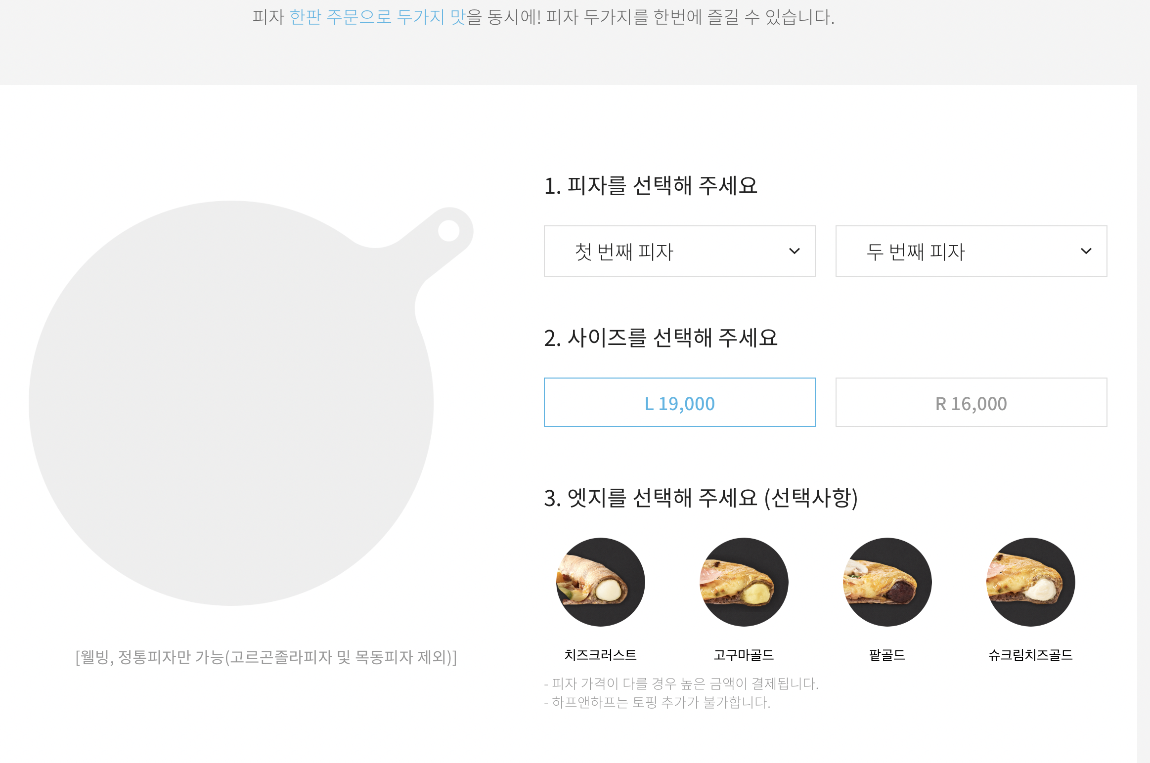 피자 알볼로는 한판 주문시 두가지맛을 동시에 주문할 수 있습니다. 엣지 역시 선택 가능하며 금액은 두개의 피자중 높은 금액으로 책정되어서 결제됩니다.