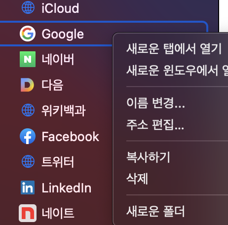오픈한 맥북 북마크 즐겨찾기를 누르시고 마우스 오른쪽 버튼을 누르시거나, 저처럼 마우스를 사용하지 않으시는 분들은 두손가락으로 한번에 터치해주시면 저런 메뉴가 뜨는것을 볼 수 있습니다.