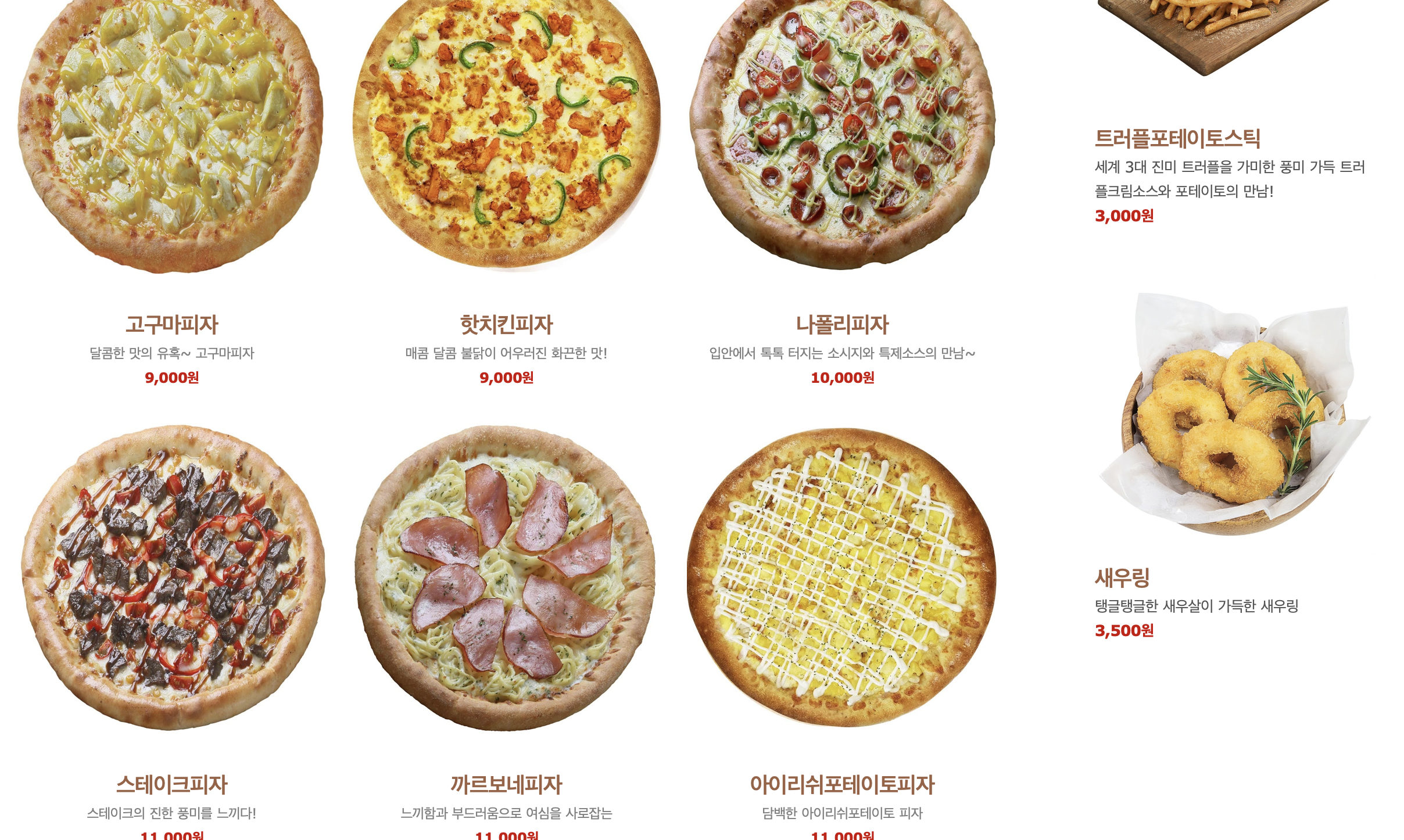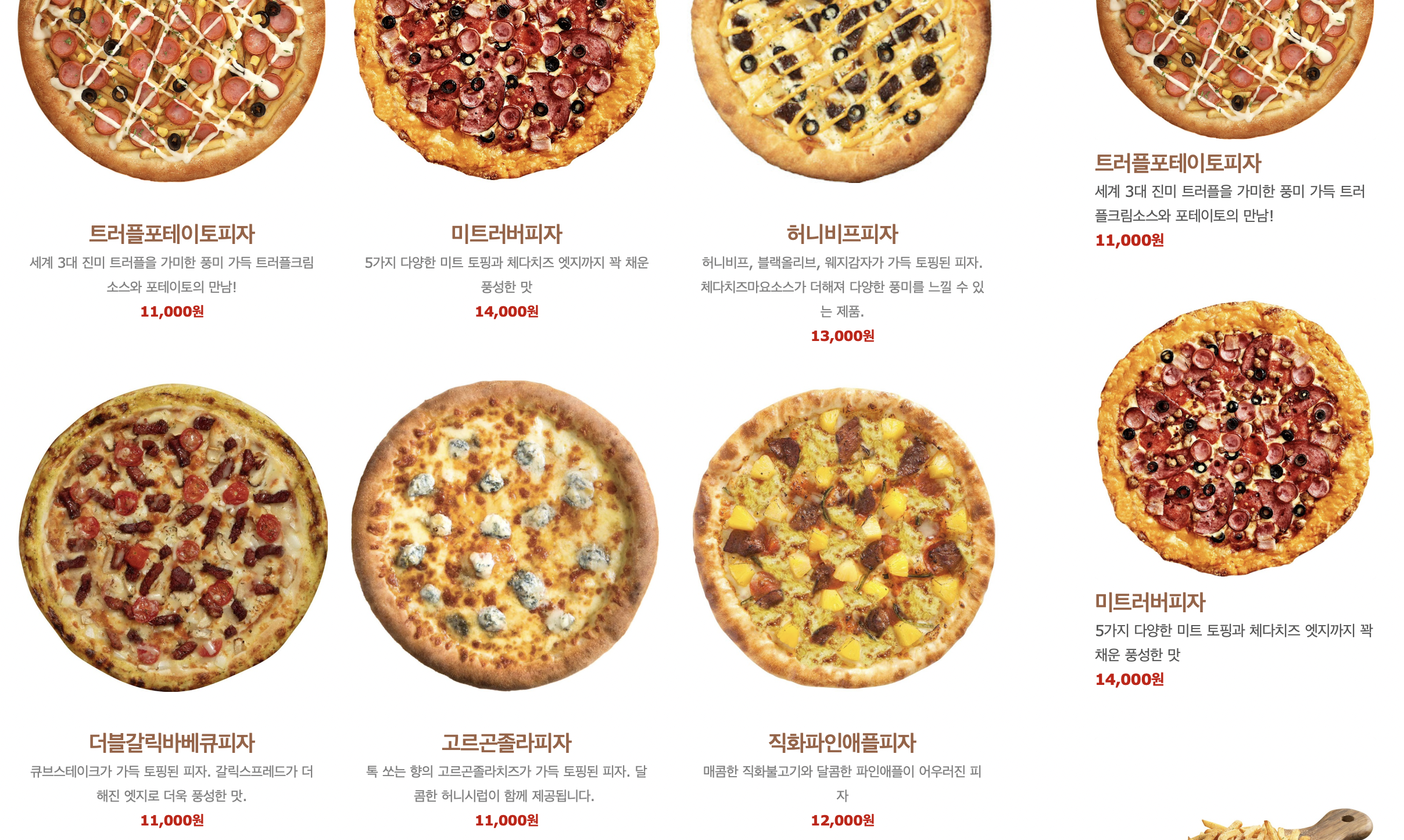 신메뉴로는 트러플포테이토피자가 있는데요 저렴한 가격 11,000원 입니다. 미트러버 피자는 14,000원입니다.