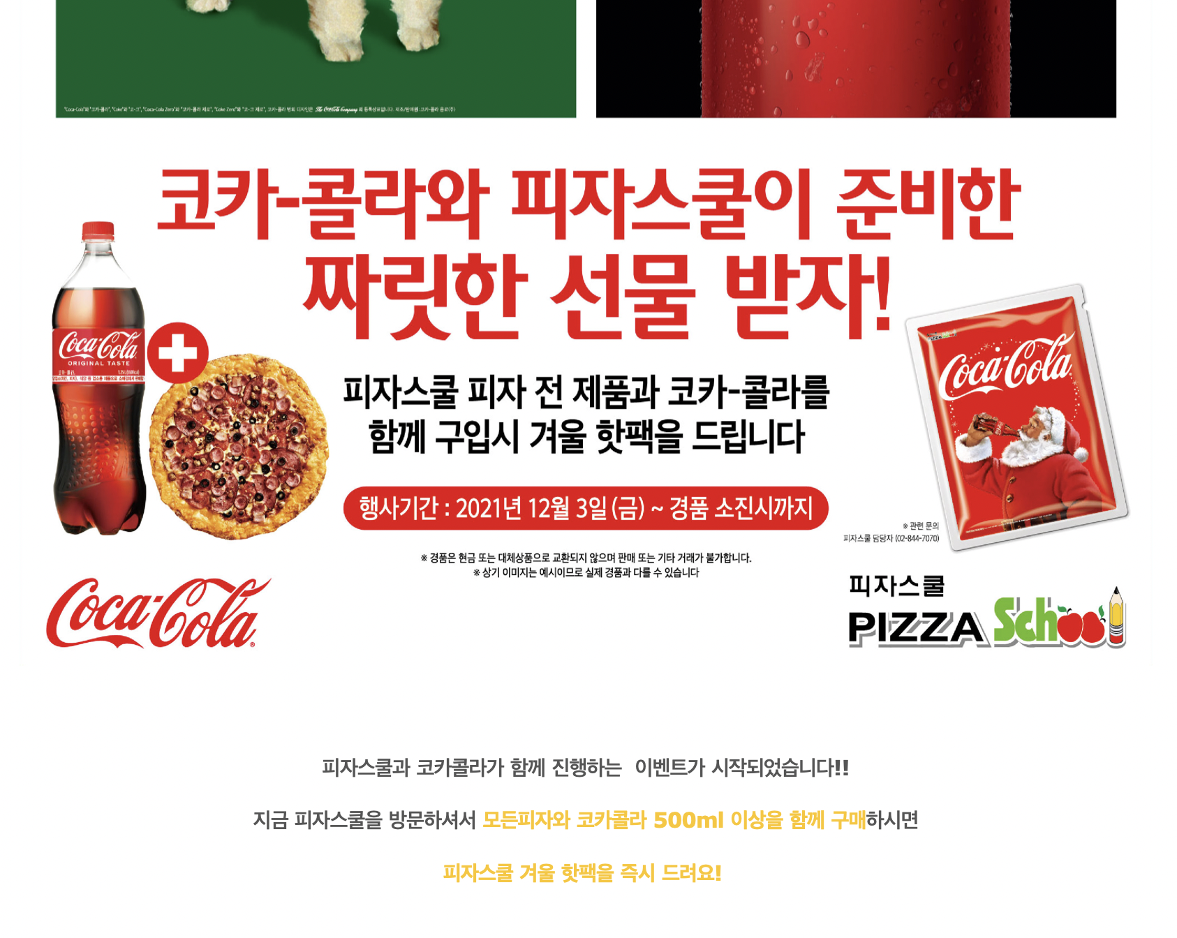 그리고 지금 피자스쿨과 코카콜라가 이벤트를 하고 있는데요 12월3일이후로 소진시까지 피자와 콜라를 구매하면 핫팩을 제공한다고 합니다.
