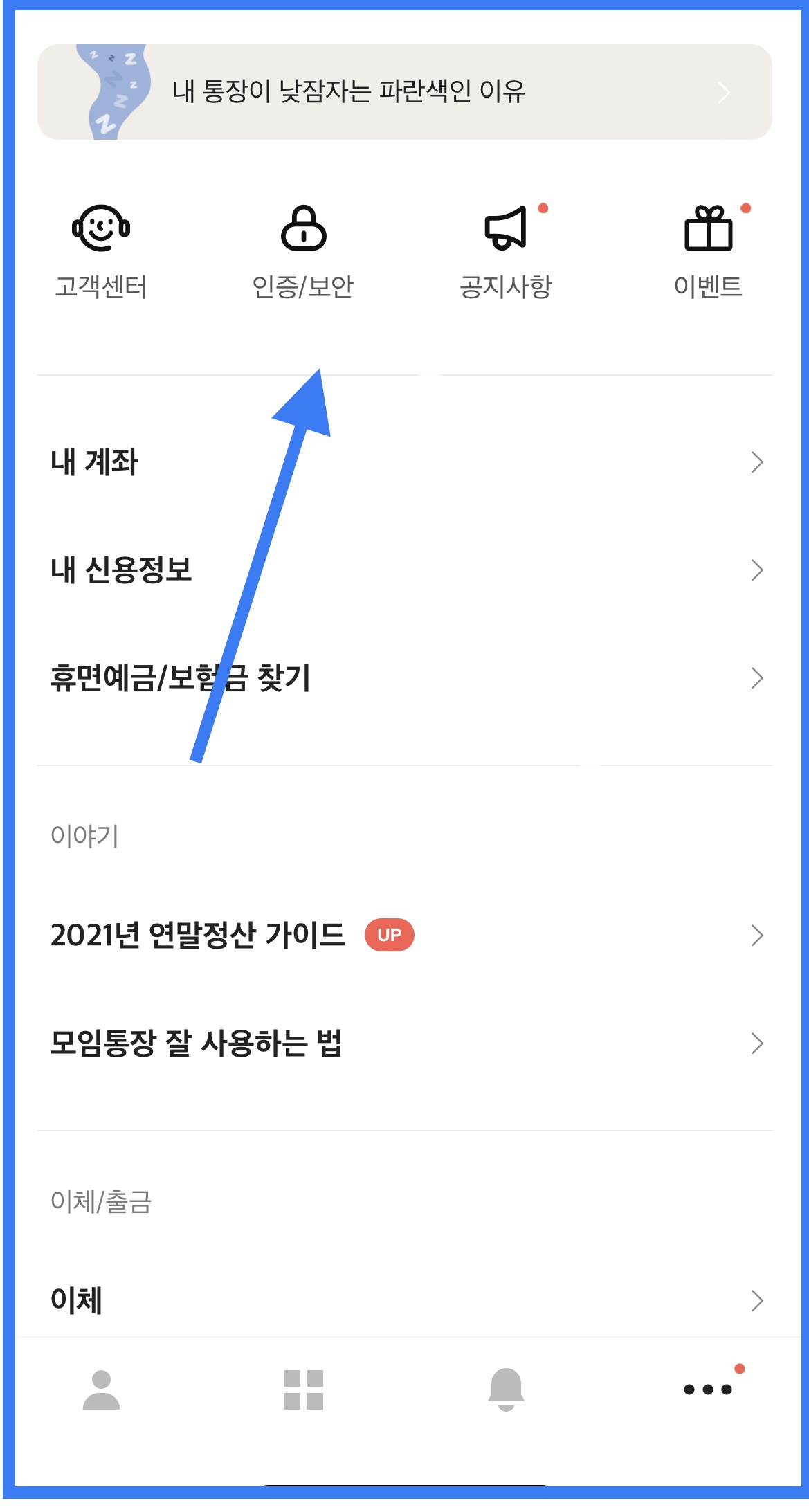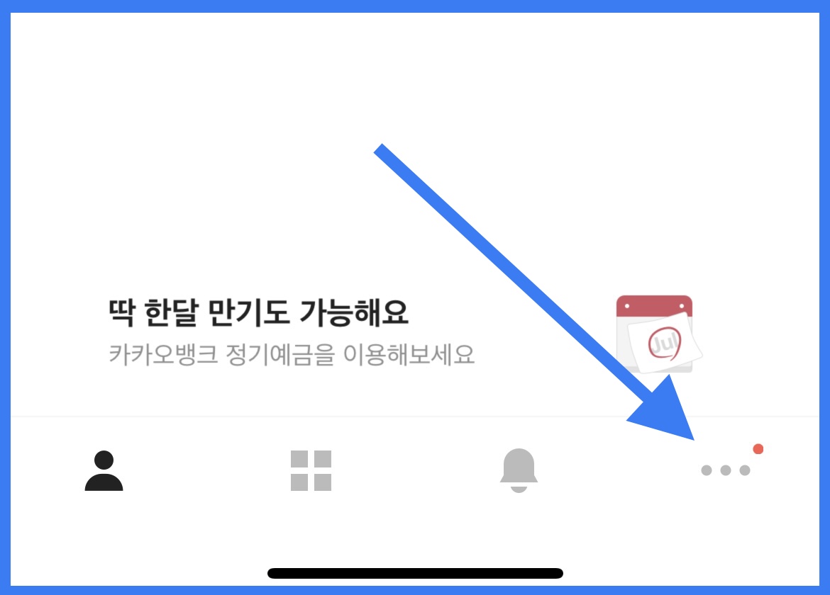 먼저 카카오뱅크 앱을 열고 화면 하단 오른쪽 점 세개를 눌러줍니다. 이 화면은 아이폰이지만 안드로이드의 경우도 마찬가지입니다.