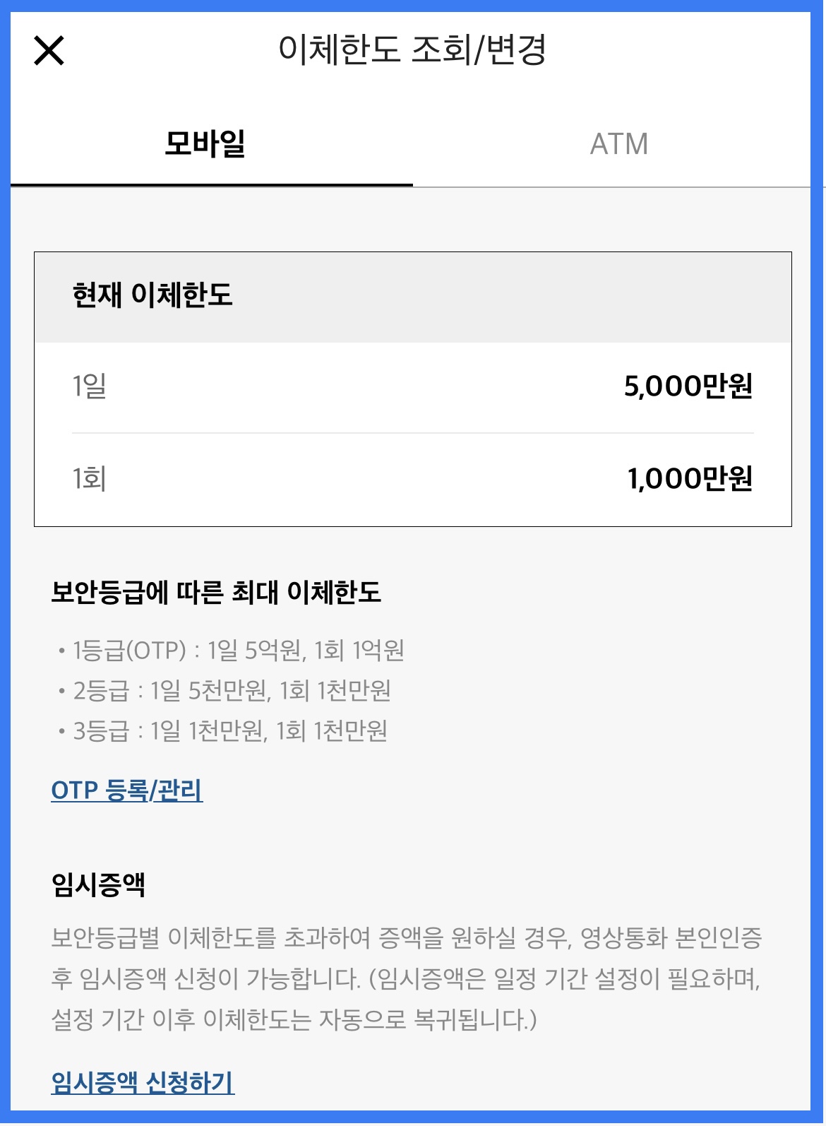 그럼 기본적으로 나의 현재 카카오뱅크 이체한도가 나오는데요, 보안등급에 따라서 한도는 조절이 가능합니다. 임시적으로 카카오뱅크 한도를 증객하고 싶으시다면 영상통화 본인인증후에 임시증액이 가능하니 이점 참고하시기 바랍니다.